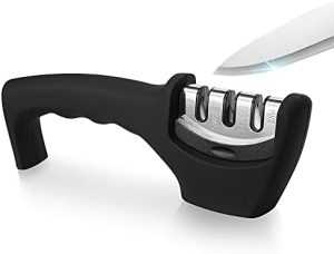 Her setup? Chrome finish, a hum that suggests precision engineering, and user-friendliness that borders on laziness. Sarah’s technique is simple. Place the knife in the slot and let technology take over. It’s quick, consistent, and foolproof – just the thing for a busy lifestyle.